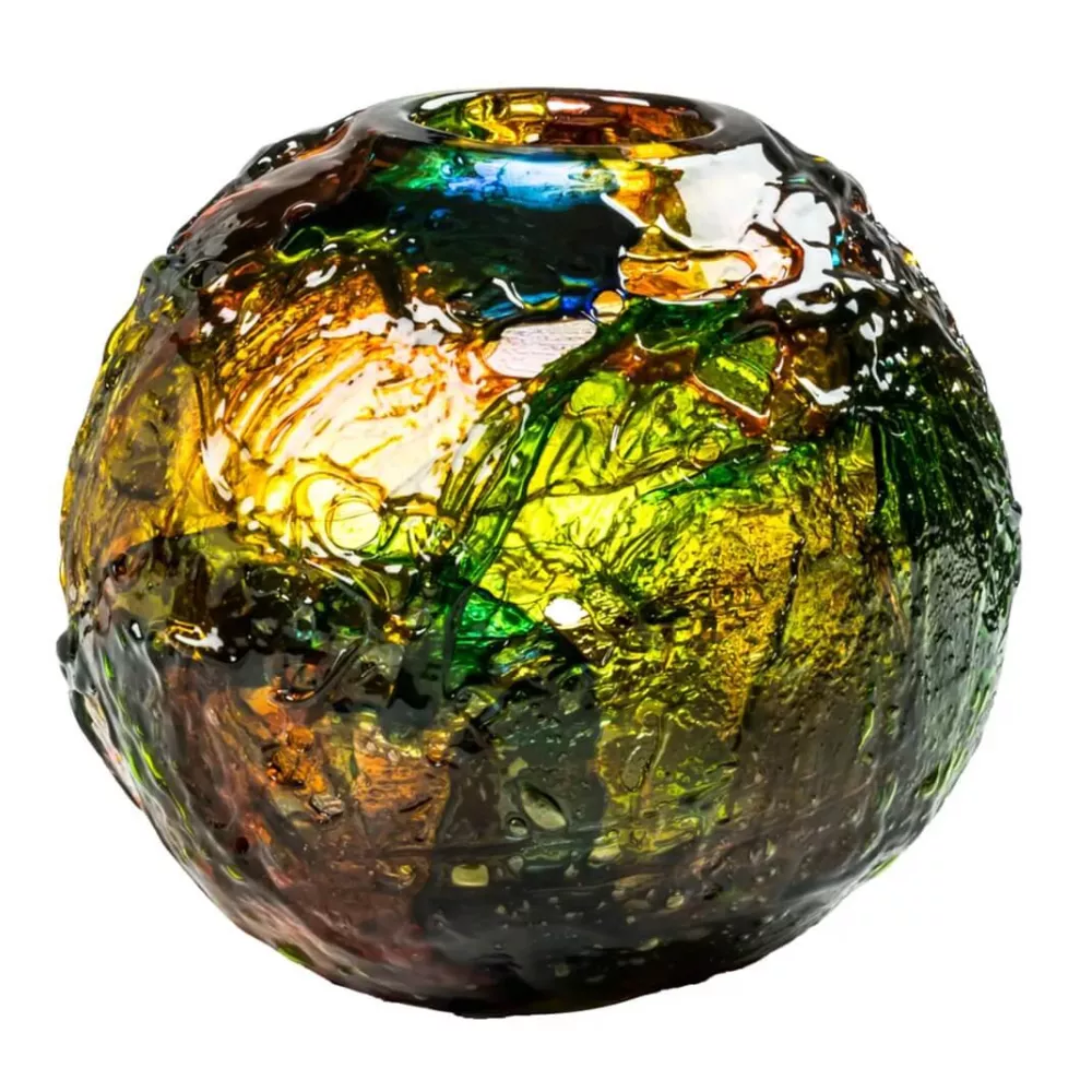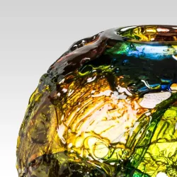 Geacolor, the masterpiece of technique and color designed by Gae Aulenti, features colors overlapping with irregular movements and rhythms. Apparent formless masses become an essence of uniqueness and diversity. The seemingly random shapes, irregular protrusions, and surfaces to explore with eyes and fingers are created with the hot-applied color technique and freehand guiding, which helps the color to position and shape itself. This vase is a thousand different vases, changing with light, angle, and the eyes of the beholder, offering a unique visual experience.