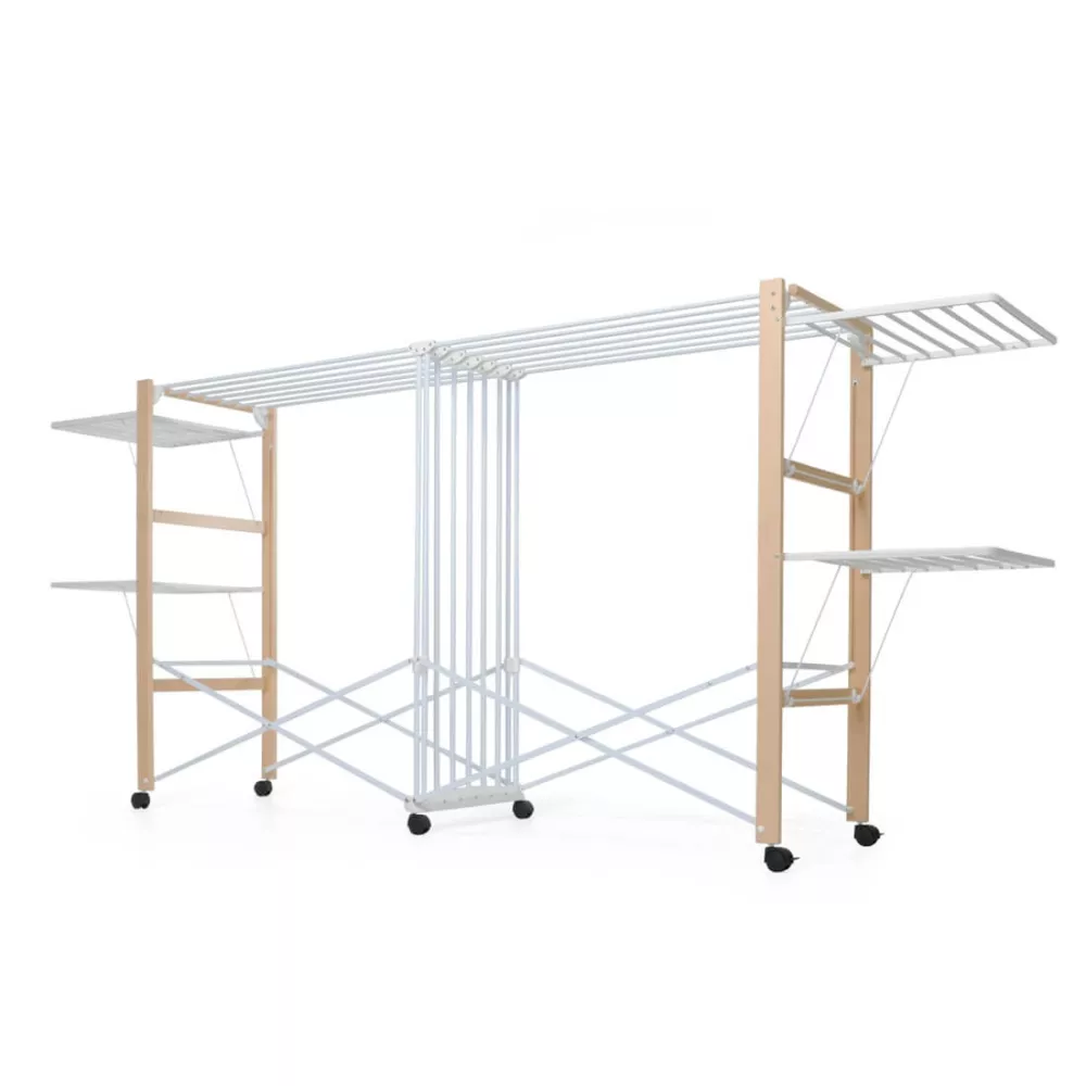 EXTENDING DRYING CLOTHES-RACK, ALLUNGO - FOPPA PEDRETTI Extendable Clothes Drying Rack with Solid Wood Structure and Independent Side Wings that Open Separately. Ideal for drying bulky laundry, especially bedsheets. Equipped with six swivel wheels. Dimensions: Open: H 128 x D 54 x W 300 cm Closed: H 128 x D 54 x W 19 cm