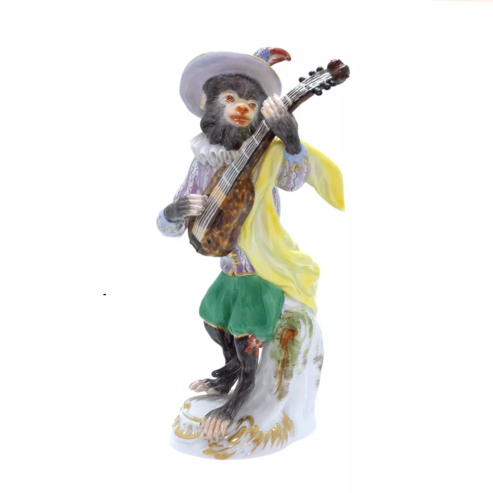 The Monkey Orchestra, consisting of 21 figurines, is one of the most whimsical classics of Meissen Baroque. It was created in 1753 by Johann Joachim Kaendler, and revised in 1765/66 together with the modeller Peter Reinicke. In this piece, Kaendler humorously encodes an anti-feudal attitude that turns to the rational, free citizen. His little monkeys are caricatures of the palace residents. They behave just like their human counterparts and their guests do: they sing, play a variety of instruments, dance, hunt or have fun skating on a frozen lake. The drawings of these extravagant musicians have found their consecration to Meissen and have clearly served the artist Johann Joachim Kaendler (1706-1775) as a starting material for his porcelain ensemble: little monkeys painted in rococo style and making music with great abandonment under the guidance of a conductor greedy for gestures. Guitarist. Dimensions: h 14 cm Hand painted Code: 900300-60017