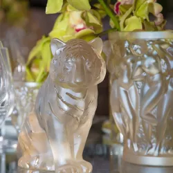 A symbol of strength and majesty, the Sitting Tiger sculpture by Lalique embodies the proud and solitary spirit of the great feline. Crafted from clear crystal with a refined gold luster finish, this imposing piece captures light and movement with extraordinary detail. A true masterpiece of decorative art, it celebrates timeless courage and elegance, making it a striking addition to any distinguished interior.