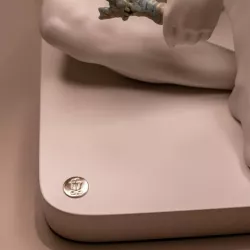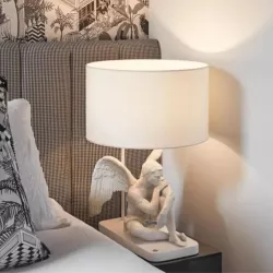 The Angel Guardian table lamp by Lladro' combines lighting functionality with sculptural excellence in a highly expressive design. The angel figure holding an olive branch, a universal symbol of peace, conveys a majestic and spiritual presence. Crafted in matte white porcelain with subtle color accents, this lamp balances the clean lines of the shade with the figurative form, creating a distinctive decorative statement.