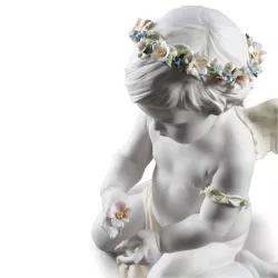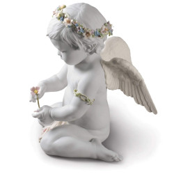 CHERUB OF OUR LOVE ANGEL FIGURINE, LLADRO Limited edition matte white porcelain figurine of an Angel decorated with soft tone enamels, featuring a bracelet and a garland composed of 19 flowers and 55 leaves. Dimensions: H 36 cm x W 28 cm x D 32 cm Sculptor: Ernest Massuet Limited edition units: 1500 SKU 1009117