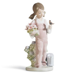 Cute porcelain statue of a girl with a pink bib carrying a bunch of flowers in one hand and a little bird in the other.