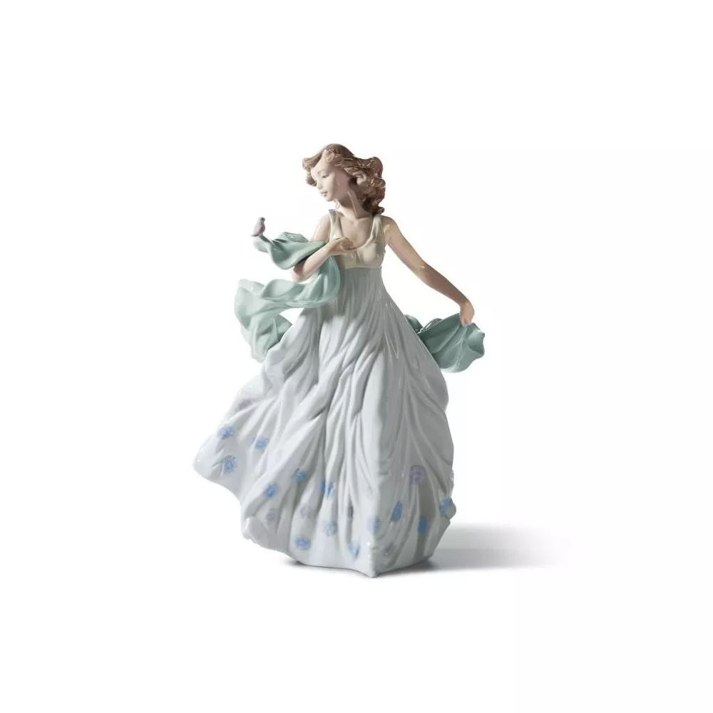 Porcelain statue depicting a woman in a long white dress decorated with blue floral details. Romance in its purest form, a perfect piece to dream and enjoy.
