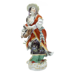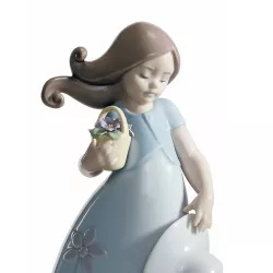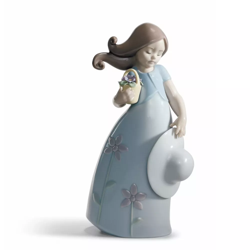 Girl figurine in glossy porcelain with a hat in one hand and in the other a basket with flowers and violet dress printed with flowers. Finished: Gloss Dimensions: H 17 m x W 9 cm x L 6 cm Porcelain Type: Gloss Sculptor: José Santaeulalia Code: 01008043