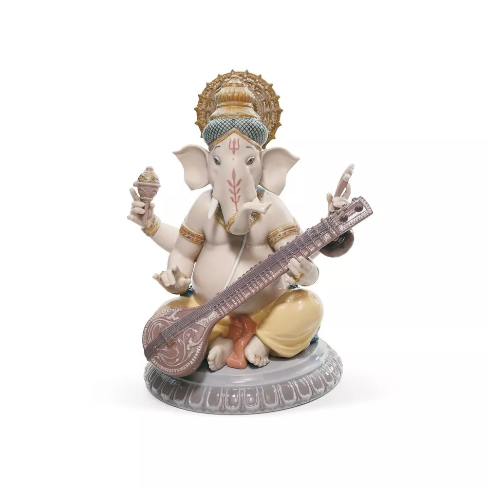 This Lord Ganesha holds a large indian guitar called veena. Furthermore the piece is full with other attributes from Ganesha¿s iconography such as the gada (or mace), the paasha (noose or rope), and the broken tusk. All of them have their symbolism explained on the ¿avatars¿ or traditional stories about Ganesha. Sculptor: Raul Rubio, Release year 2007 Dimensions: 23 x 19 cm