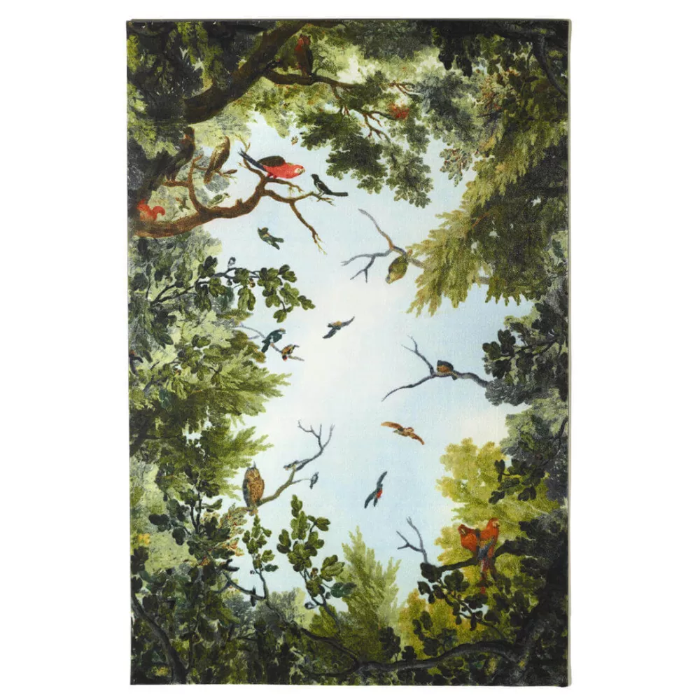 Add a touch of the sky to your home with the Rectangular Sky Rug, a masterpiece created by Marcantonio that captures the eternal beauty of nature and its intrinsic connection with humanity. This rectangular rug made of synthetic fiber features a quad-color print depicting a blue sky surrounded by the green foliage of trees, inhabited by colorful birds soaring through the sky