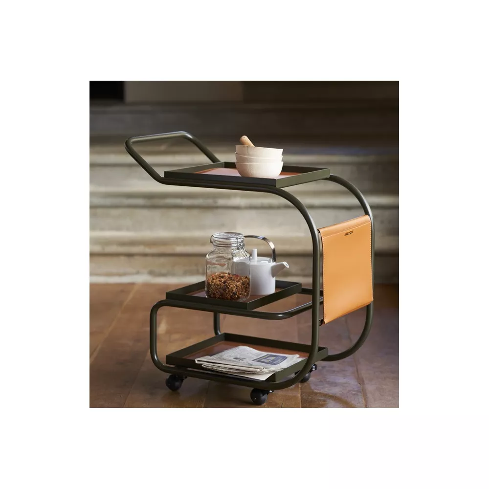 A versatile and functional cart that can be used as a bar cart or an independent workstation, Zenzero is truly captivating! Comprising three steel trays mounted on an elegant structure made of thin steel tubes, it also features a practical pocket made of regenerated leather on the front, along with a handle and pivoting wheels. Perfect for holding cups and pitchers, Zenzero, designed by Samer Alameen, transforms into an autonomous workstation for preparation and serving, thanks to the two removable trays, wherever needed. Sophisticated and precious in the gold leaf version, it is also available in white or dark green lacquered variants. Code: ZENZEROLG Dimensions: 81x41 cm, h 72 Material: steel, regenerated leather Finish: gold leaf Weight: 18 kg Volume: 0.32 m³