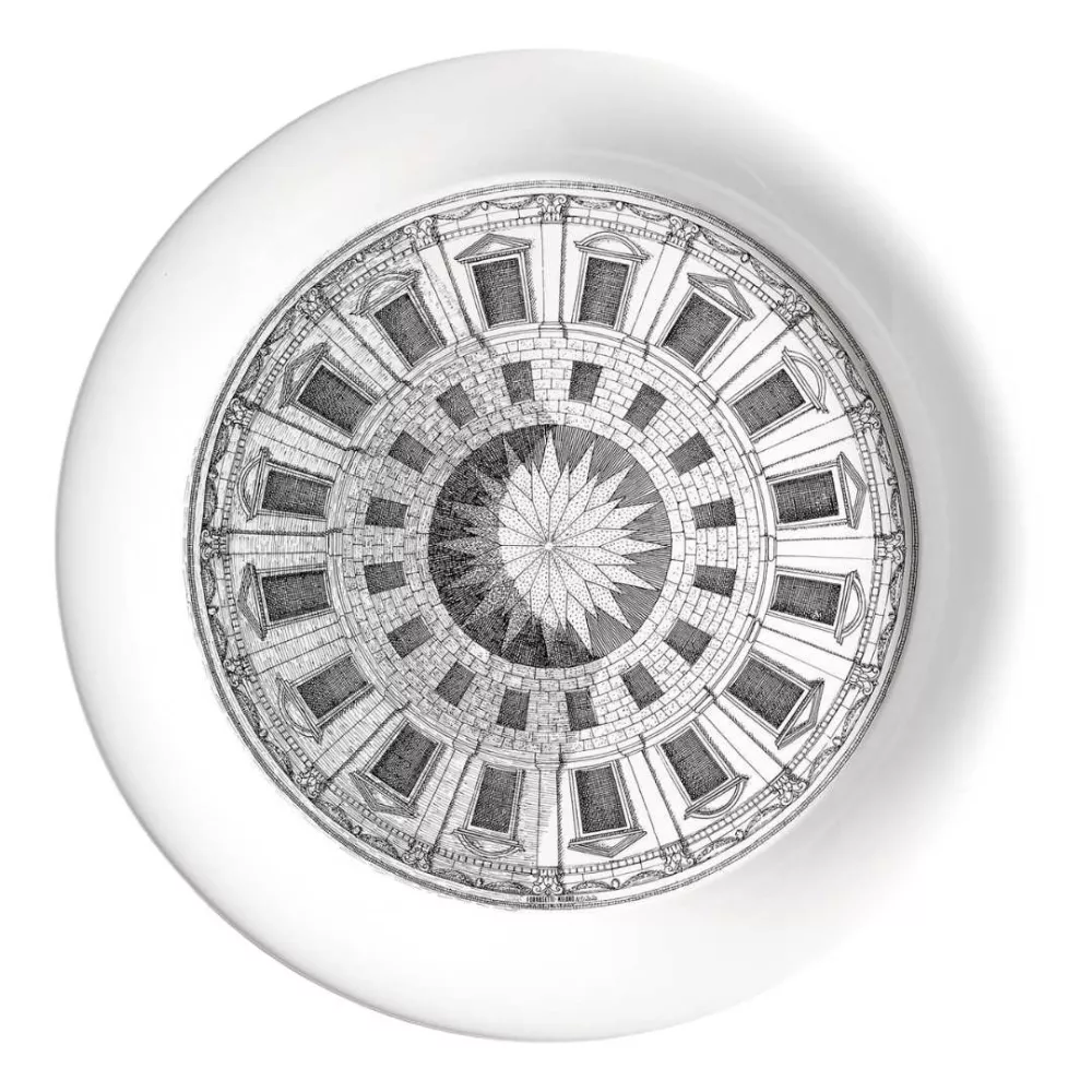 The Cortile Tray by Fornasetti highlights the Atelier s mastery of perspective through its circular shape and flat surface, enhancing every decorative detail. Hand decorated, the architectural motif playfully explores perspective to create a refined optical illusion that captivates the eye. A striking decorative piece that can be displayed on its own or paired with a folding stand to transform into an elegant side table. Any slight differences between similar creations are the result of artisanal craftsmanship and confirm the uniqueness of each piece.