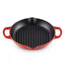 The Le Creuset Evolution round cast iron grill delivers perfect searing and authentic barbecue-style results from your kitchen. Ideal for meat, poultry, and vegetables, it ensures even heat distribution while draining excess fat. Made from enameled cast iron, it offers superior heat retention and durability, without absorbing flavors or odors. The dual spout handles provide a safe and secure grip, and the enamel interior naturally develops a semi-nonstick patina over time. Suitable for all heat sources including oven, stovetop, grill, and induction, it’s also dishwasher-safe and freezer-friendly. A versatile and elegant cooking essential backed by Le Creuset’s lifetime guarantee.