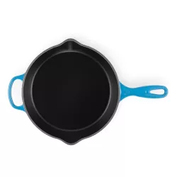 23 cm or 26 cm ENAMELED DEEP DOUBLE POUR SPOUTS SKILLET - LE CREUSET Chefs and amateur cooks trust our frying pan blindly: thanks to its Matte Black enameled interior, caramelization reaches unprecedented results. Indispensable in the kitchen, it can be used on the stovetop, in the oven, even under the grill mode, and it's suitable for searing, sealing, and browning. The enameled cast iron allows for perfect heat distribution and retention. It is the most durable and hygienic material on the market as it doesn't absorb moisture, flavor, or odor from food. Compatible with all heat sources, suitable for: oven, stovetop, and oven under grill mode. Easy to clean. Handles designed for an excellent grip, the elegant and comfortable handles allow for safe lifting of the product. Exceptional durability. Lifetime warranty. Dishwasher safe. Freezer safe