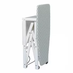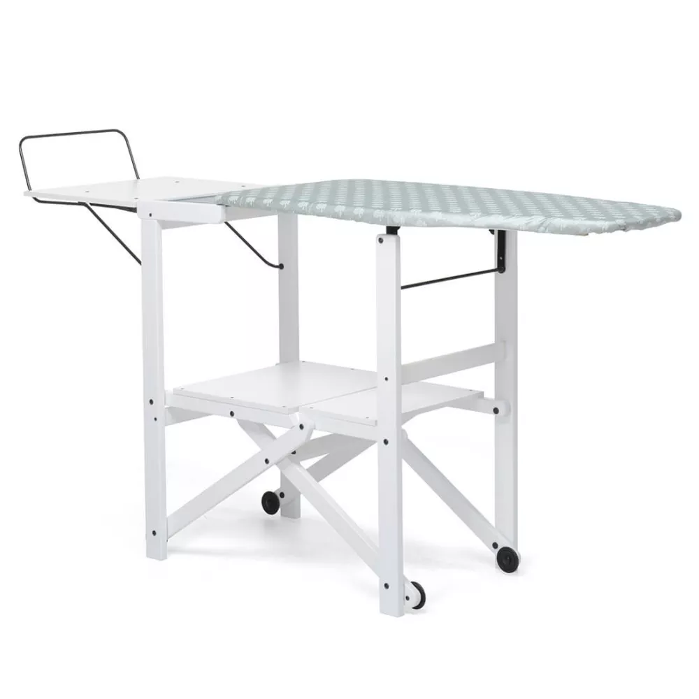 The Asso foldable ironing board by Foppapedretti features a contoured surface, perfect for ironing even bulky garments. Equipped with convenient support shelves and scratch-resistant rubber wheels, it can be fully closed when not in use, saving space.