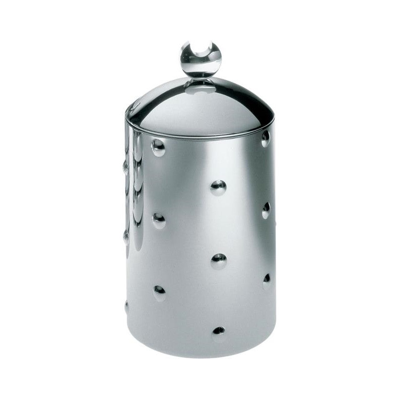 ALESSI KALISTÒ 1 Kitchen box in 18/10 stainless steel mirror polished with knob in aluminium. code: CB01 dimensions: h. 21 cm diameter: 11 cm capacity: 114 cl