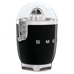 CITRUS JUICER, 50's STYLE, CJF01 - SMEG The CJF01 Citrus Juicer from Smeg's 50's Style aesthetic line is a device that combines captivating design, reliability, and high performance. The juicer's body is made of die-cast aluminum, while the filter, spout, and cone are made of stainless steel. The base of the juicer is plastic, and the lid and juice collector are made of durable Tritan™ material. The Smeg citrus juicer is equipped with a powerful 70W motor with an integrated on-off sensor. It also features a juice collector and an anti-drip spout that allows you to interrupt the juice flow to avoid any mess on the kitchen counter after use. In addition to these features, the CJF01 model stands out for its ease of use and cleaning. It also comes with a dust cover to protect the product when not in use. Furthermore, all components are easily detachable for convenient cleaning.