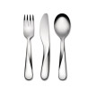 Children cutlery set in 18/10 stainless steel: fork, spoon and knife Lenght: 15 cm Giro Kids is a set of cutlery consisting of knife, fork and spoon. Careful adaptation to the needs of very young children has made these the perfect tools for eating their first meals on their own. The fork has rounded tips and wide prongs, with a slightly cupped shape, similar to that of a spoon. The knife has a rounded tip and a blunt blade.