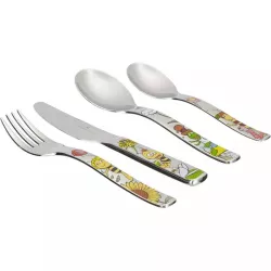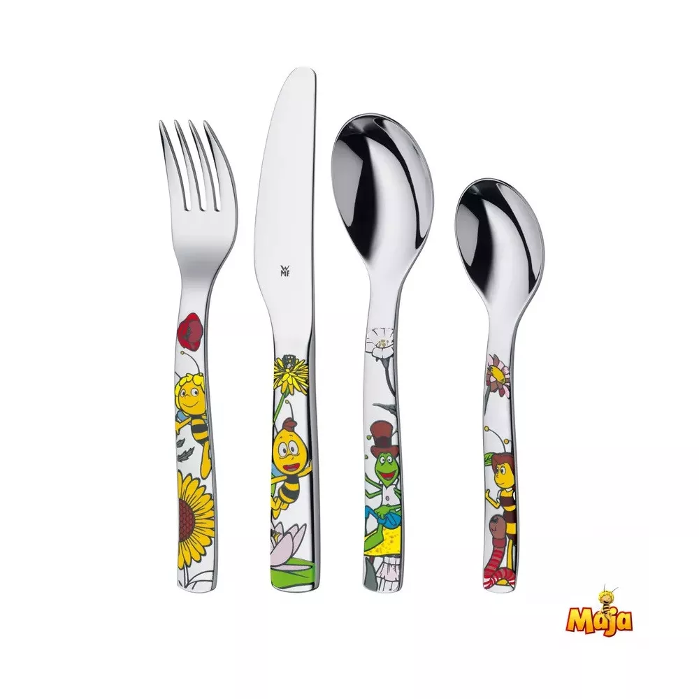 CUTLERY SET OF 4 PIECES, MAYA THE BEE, 9440.6040 - WMF This tableware set is perfect for one person and includes a fork, a knife, a spoon, and a teaspoon, for a total of 4 pieces. Made of stainless steel, these utensils are sturdy, rust-resistant, and long-lasting. The product color is stainless steel, creating an elegant and refined look on the table. This cutlery set is suitable for everyday use or special occasions. Additionally, the utensils are dishwasher safe, making cleaning a breeze. Add this tableware set to your cart for a perfect dining experience! Sku: 12.9440.6040