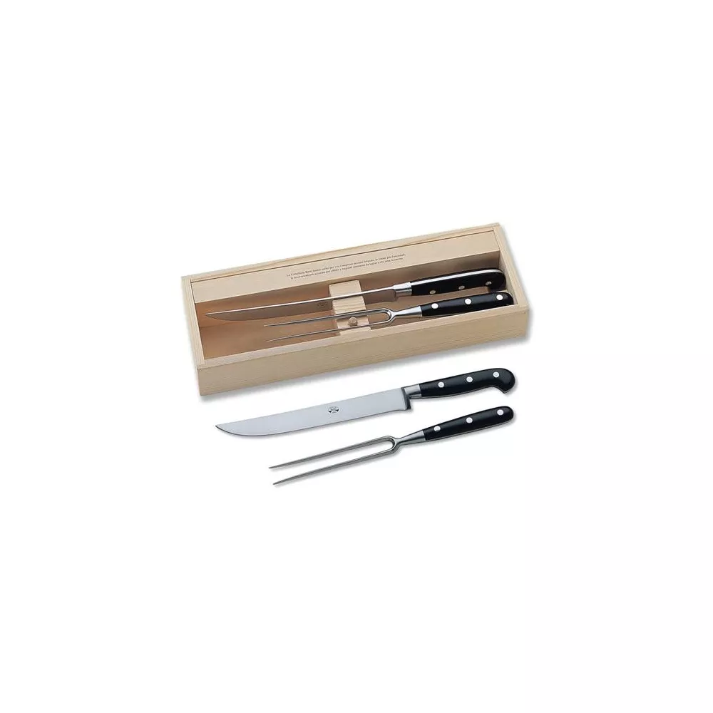 The Berti 2-piece forged carving set includes a carving knife and a carving fork, perfect for slicing and serving meat with precision and ease. Both tools are forged, ensuring strength and durability, while the black handle adds a classic touch and comfortable grip. Handcrafted in Italy, this set exemplifies the finest Italian craftsmanship, making it ideal for both everyday cooking and elegant dining occasions.