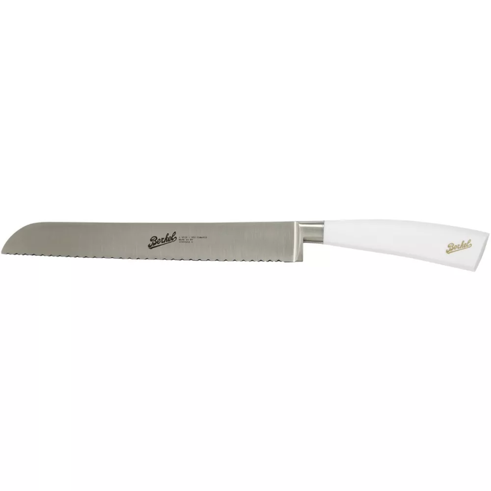 Berkel Elegance 22 cm Bread Knife The knife for baked goods Sturdy and handy knife. Thanks to its serrated blade, it allows you to slice hard or soft crust bread. Suitable for medium and large sizes. Blade material: Forged in nitrided 1.4116 stainless steel (hardness up to 59 HRC) Blade length: 22 cm Total length and weight: 36 cm / 230 g Sharpening: Serrated, with teeth Handle: Made from a single piece and assembled with special resistant adhesives SKU: KEP1BR22SR