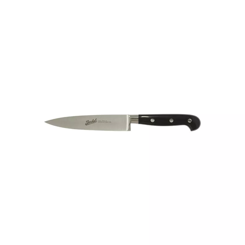 Berkel Adhoc Kitchen Knife 16 cm Short and user-friendly knife. Its tip and short blade make this knife indispensable in the kitchen for cutting and finely chopping meat, fish, fruit or vegetables. Sku: KAD1C016SRBBL Blade material: Forged stainless steel 1.4116 alloyed with nitrogen (hardness of up to 59 hrc) Blade length: 16 cm Total length and weight: 29 cm / 150 gr Edge: Smooth, toothless Handle: Consists of two scales assembled with aluminium rivets DISCOVER THE COLLECTION: AdHoc Knives | Berkel
