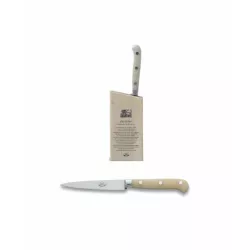The Berti paring knife with a white handle is an essential kitchen tool, perfect for precision tasks such as peeling fruits and vegetables or slicing small items. Its short, sharp blade provides excellent control during use. The ergonomic white handle ensures a secure and comfortable grip. This knife comes with a block for convenient and safe storage, making it a versatile and indispensable addition to any kitchen.