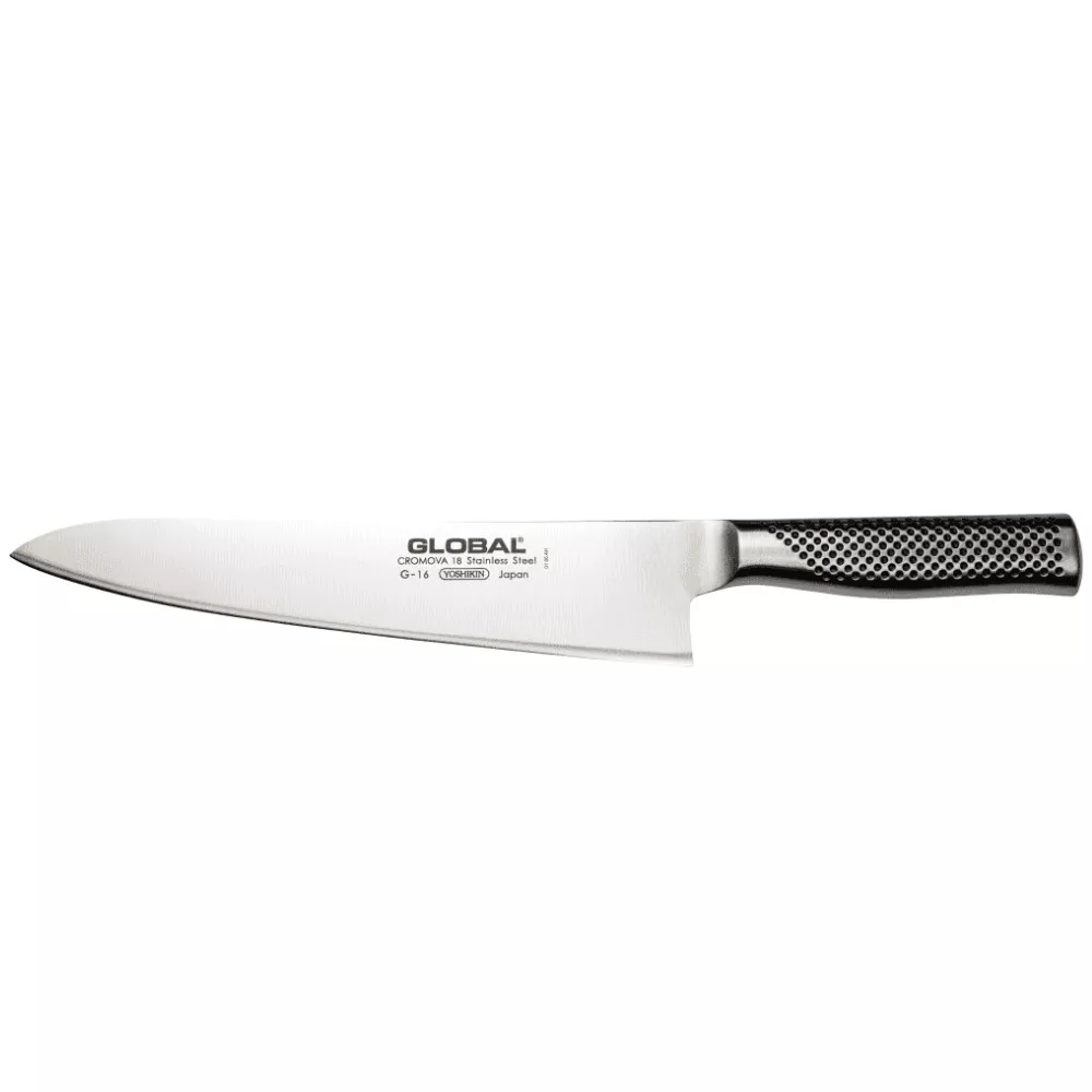 The G-16 is the larger sibling of the iconic G-2, designed for professionals and heavy-duty kitchens. With a longer 24 cm blade and a more cylindrical handle, it provides greater reach and leverage for slicing, dicing and chopping large ingredients. A top-tier knife from the Global G series, ideal for chefs seeking precision and strength.