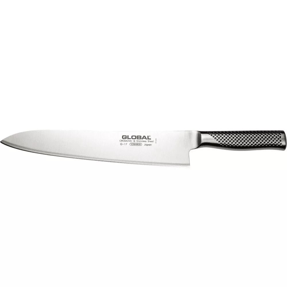 The G-17 is the longest chef’s knife in Global’s G Series: a powerful 27 cm blade built for professional chefs who require precision and efficiency when preparing large quantities. Its long, sleek blade is perfect for slicing through large cuts of meat, big vegetables, or prepping in high-volume kitchens.