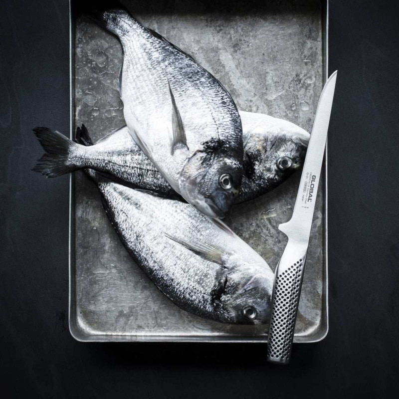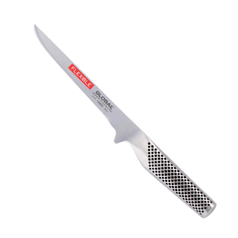 The Global G-21 is a classically shaped and best-selling boning knife in the Global range. Its long, narrow 16 cm blade tapers to a fine point, allowing precise work around the bones in cuts of beef, lamb, or pork, making it ideal for extracting sizable pieces of meat.