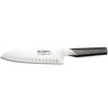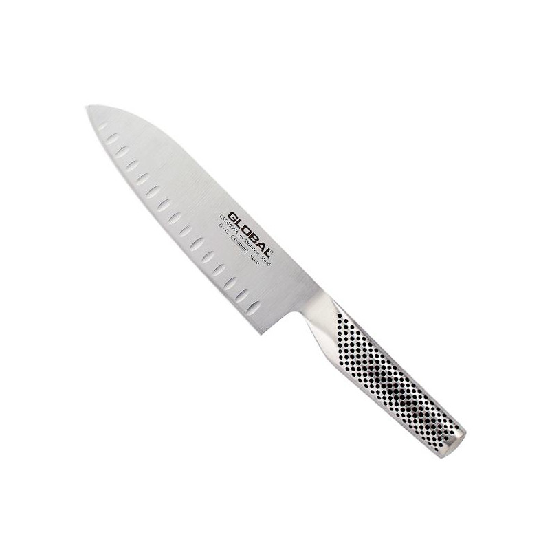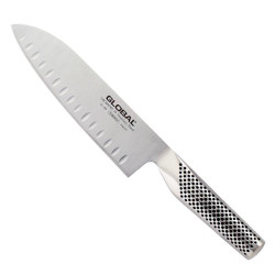 The 18cm G-80 fluted Santoku knife by Global is a versatile tool perfect for slicing, dicing, and mincing. The fluted blade helps reduce friction and prevents food from sticking, ensuring smooth, clean cuts every time.