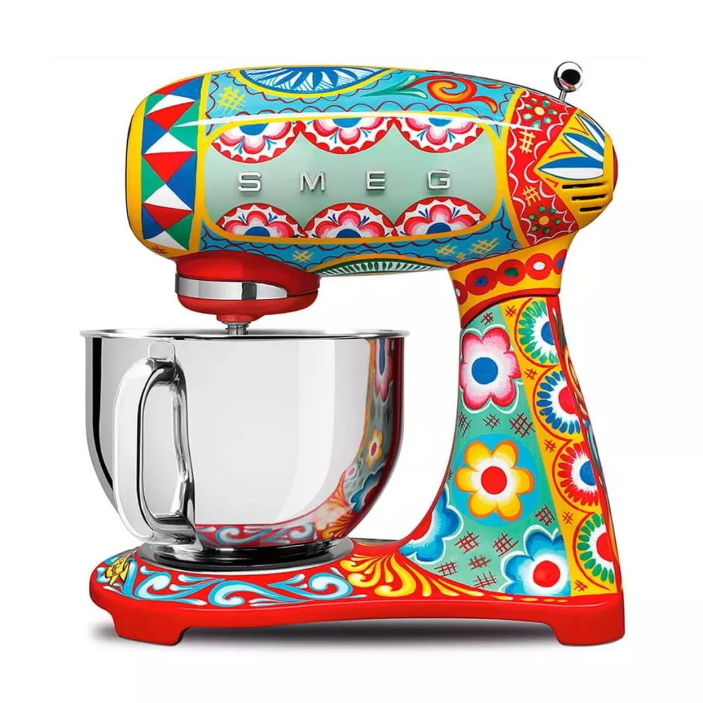 DOLCE & GABBANA MIXER, SMF03DGEU - SMEG A mixer with a 1950s design and style. Cast aluminum body and base, stainless steel bowl, and plastic lid. Add a touch of color to your kitchen with the special edition made in collaboration with D&G. Technical features: 10 speed levels Smooth start function Stainless steel control lever Planetary movement 4.8 L bowl with handle Non-slip base Motor safety lock General specifications: Dimensions HxWxD 378 (490 with head raised) x 402 x 221 mm Net weight 9.180 kg Electrical specifications: Power 800 W Voltage 220-240 V Frequency 50 Hz Cable length 1 m Smeg code: SMF03DGEU.