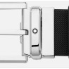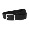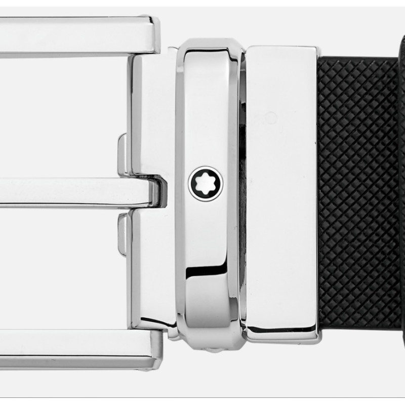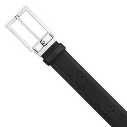 BLACK BELT, 126028 - MONTBLANC This belt features a rectangular buckle with a polished palladium finish and roller detail. The belt is self-adjustable, measuring 3.5 cm x 120 cm, and is made of black stamped bovine leather with a pigmented finish, giving it an urban look. The buckle mechanism allows for easy adjustment of the belt length. The buckle has a rectangular shape and is coated with palladium. The Montblanc emblem is present on the metal loop. The belt color is black and its dimensions are 120 x 35 cm.
