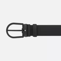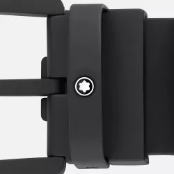 Black rubber-coated horseshoe buckle. Self-adjusting strap, 3.5 cm x 120 cm, in black calfskin leather with a rubber effect. Designed for a bold look. Ident No. MB129431 Material Calf-skin leather Strap Black bovine leather with rubber effect Practical length adjustment mechanism Shape: Horseshoe Montblanc emblem on the metal loop Color: Black