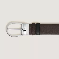 This Montblanc reversible belt in Sartorial leather embodies refined versatility and confident style, designed to complement both formal and contemporary outfits. The classic black side conveys timeless elegance, while the deep ebony side introduces a subtle modern touch. The 35 mm width creates a strong visual statement, enhanced by a sophisticated horseshoe buckle with polished palladium finish. A high end leather accessory that reflects Montblanc craftsmanship and stands as the perfect gift for a polished and distinctive look.