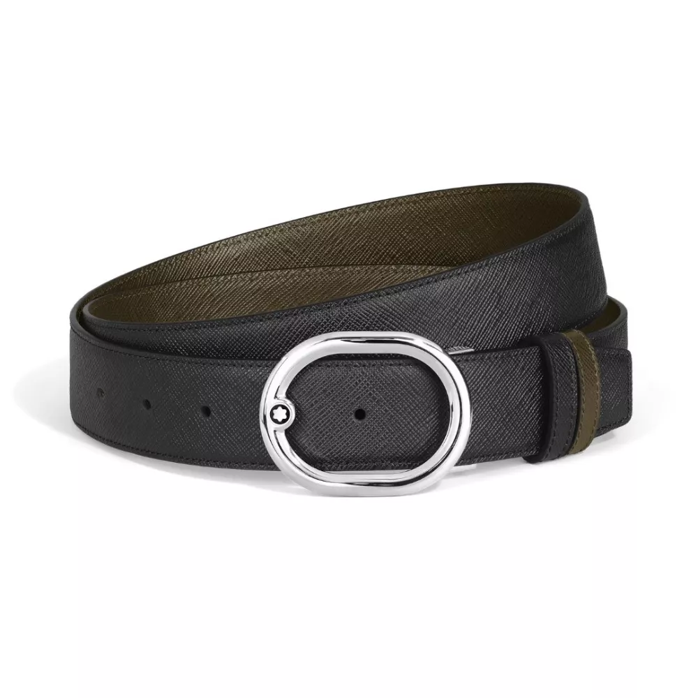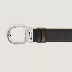 This Montblanc reversible belt in Sartorial leather conveys modern sophistication through a refined and contemporary design. The oval buckle with polished palladium finish reimagines the classic belt with a dynamic and distinctive silhouette. The embossed Sartorial leather offers a choice between a timeless black side and a versatile khaki side, balancing formal elegance with a modern aesthetic. The 35 mm width provides a confident presence, making this accessory ideal for polished and personal looks, also conceived as the perfect gift.