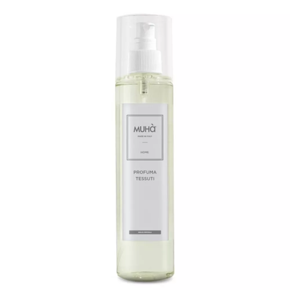 The Dolce Coccola fabric spray by Muhà delicately scents fabrics with a warm, comforting fragrance. Its sweet and cozy aroma creates a sense of well-being, perfect for refreshing the atmosphere of your home and surrounding spaces with harmony and intimacy.