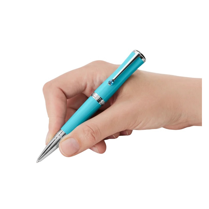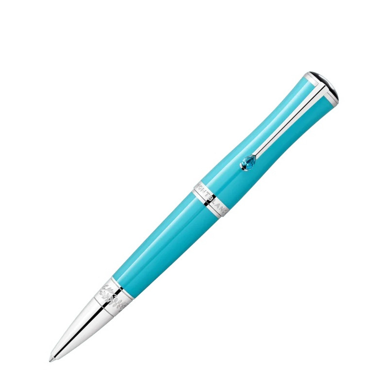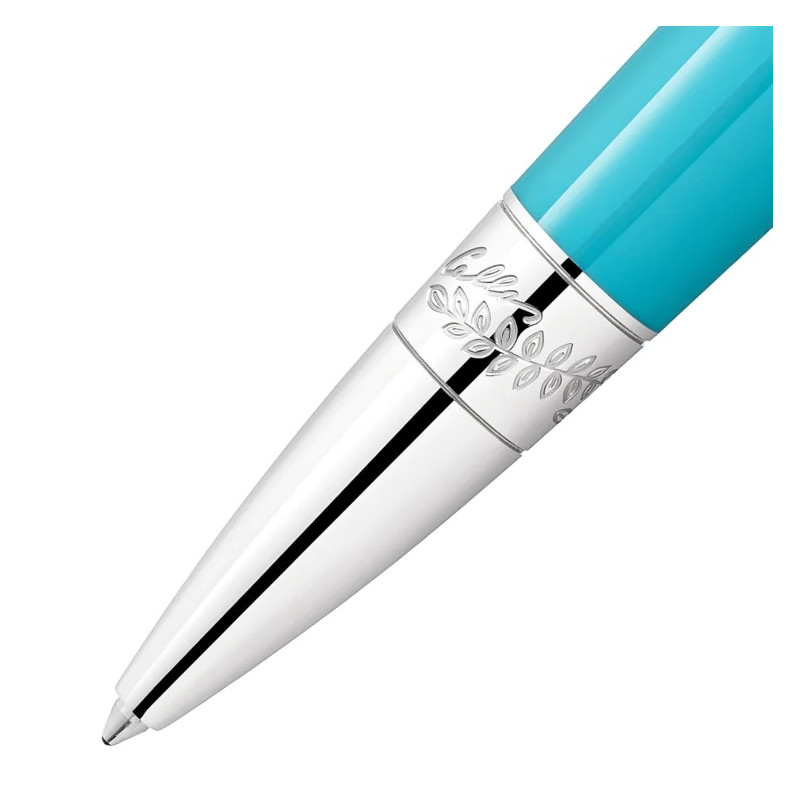 The Montblanc Muses Maria Callas Special Edition is dedicated to one of the most charismatic sopranos of the 20th century and appreciated style icon. With her talent, passion and personality, she embodied a certain ideal of the operatic diva. In some of the world’s greatest opera houses, from La Scala in Milan, to the Paris Opera, to New York’s Metropolitan Opera, she was known as “La Divina” – the divine one. The edition highlights one of her favourite colours, turquoise, in the precious resin of the cap and barrel, while reflecting Maria Callas’s graceful beauty in its slender, elegant silhouette. In memory of her sea-encircled Greek homeland, the platinum-coated clip is decorated with a stone whose colour is reminiscent of the radiant turquoise blue of the Aegean Sea. A costume detail from one of her recognizable bel canto roles, Bellini’s “Norma”, is reflected in a pattern of laurel leaves surrounding the platinum-coated cone of the edition along with the embossed signature of the celebrated soprano. Barrel Description: Precious resin Cap Description: Precious resin Colour: Turquoise