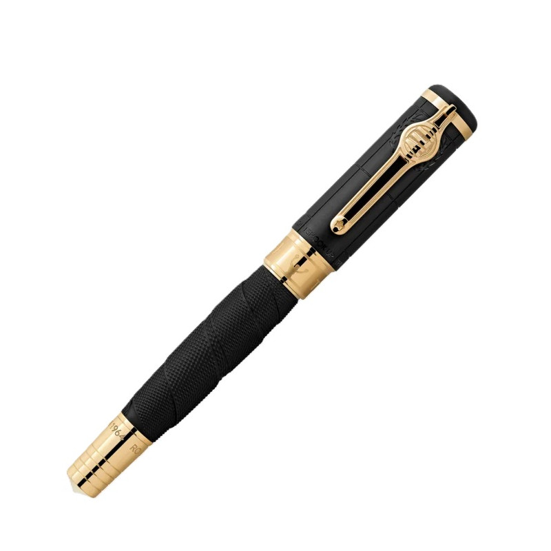 Crafted from precious black resin, the cap replicates the shape of a punching bag, while the body design recreates the boxing wraps worn by fighters to protect their hands. The cap features various decorative elements, including a famous exclamation by Ali and a butterfly inspired by his iconic fighting style: "Float like a butterfly, sting like a bee". The pointed cone reflects this concept and bears engraved lines representing the ropes of the ring. The inscriptions on the cone refer to Ali's victory at the 1960 Rome Olympics and his first heavyweight championship win in Miami in 1964. The cap ring details his victory, indicating his win in the seventh round by technical knockout.