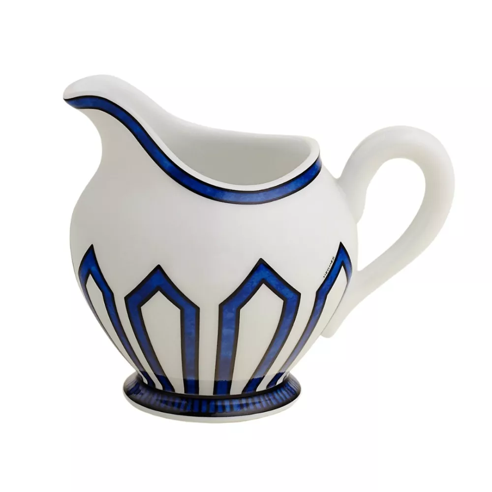 The Bleus d’Ailleurs creamer by Hermes is crafted from fine porcelain with hand-applied screen-printed decorations. The blue hues, symbolizing travel and discovery, merge with the pure white of kaolin, creating geometric motifs full of timeless charm. A refined piece that enhances any table setting with elegance, blending nomadic spirit and contemporary design.