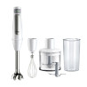 The MultiQuick 7 White hand blender, with power up to 1000W, features the new PowerBell Vplus technology, which delivers 50% faster performance and 5 times more even results*. Equipped with 6 shredding teeth and an extra blade, it makes preparation easier by reducing effort. The speed is adjustable with a single touch thanks to Easy SmartSpeed technology, which responds to the applied pressure. The SplashControl technology ensures a clean and splash-free countertop, while the EasyClick system allows for easy accessory replacement. Included Accessories: 500ml chopper with ice-crushing blade Whisk 600ml measuring beaker The accessories are dishwasher safe. *Compared to MQ100 with almond milk.