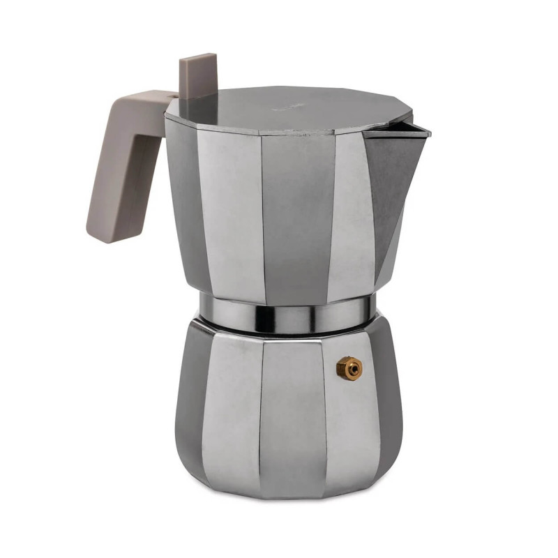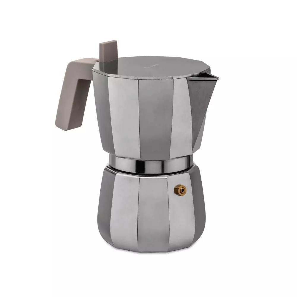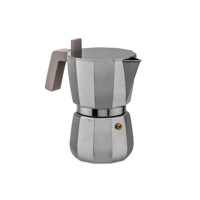 MOKA ESPRESSO COFFEE MAKER, DC06 - ALESSI A coffee maker with a familiar and at the same time innovative form. Designed by architect David Chipperfield, Moka is an artist's interpretation of a timeless icon of the Italian culture. Chipperfield introduces a series of details that make the Moka design new and even more functional, such as the flat lid on which to place the cups to be heated - allowing optimum enjoyment of the aroma and flavour of the drink. Espresso coffee maker in aluminium. Handle and knob in grey