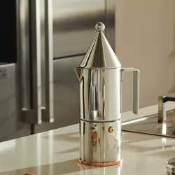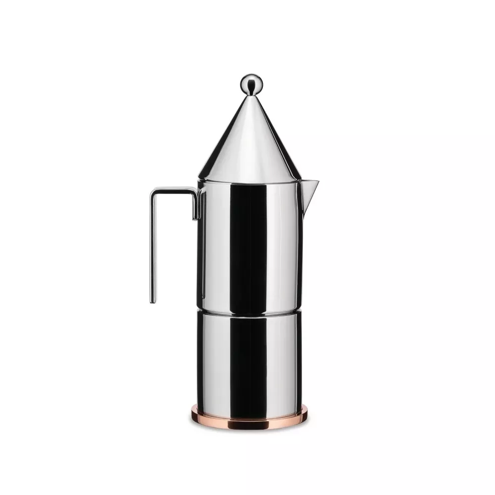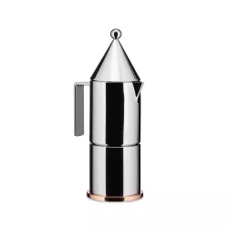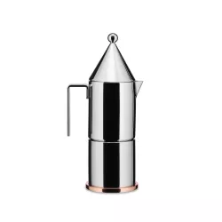 MOKA COFFEE MAKER, LA CONICA 90002 - ALESSI La Conica, the first espresso coffee maker project by architect Aldo Rossi, arises from a play of simple geometric shapes that form a miniature table architecture with a concise and elegant style. A timeless icon, La Conica has a stainless steel body and a copper bottom: a refined object with essential geometric lines that give life to a functional tool for brewing and serving coffee. Espresso coffee maker in polished 18/10 stainless steel with a copper bottom.
