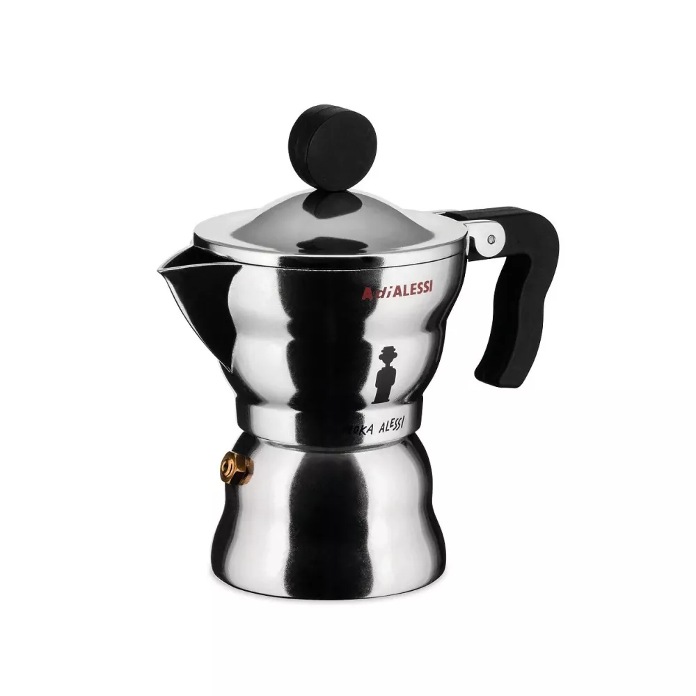 MOKA ALESSI Espresso coffee maker in aluminium casting. Handle and knob in thermoplastic resin, black. 3 CUPS code: AAM33/3 Diameter : 9.60 cm Height : 16.40 cm Content : 15.00 cl