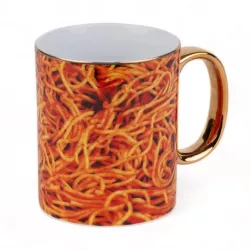 The Spaghetti mug from the Seletti Wears Toiletpaper collection blends art, irony and eccentric design. Made of porcelain with real gold detailing, it is the result of the collaboration between Maurizio Cattelan and Pierpaolo Ferrari, merging surreal imagery with a unique style. A daily object turned into an icon of creativity and originality.