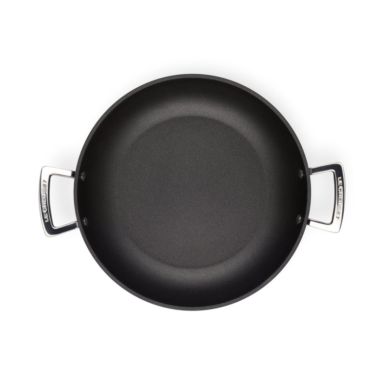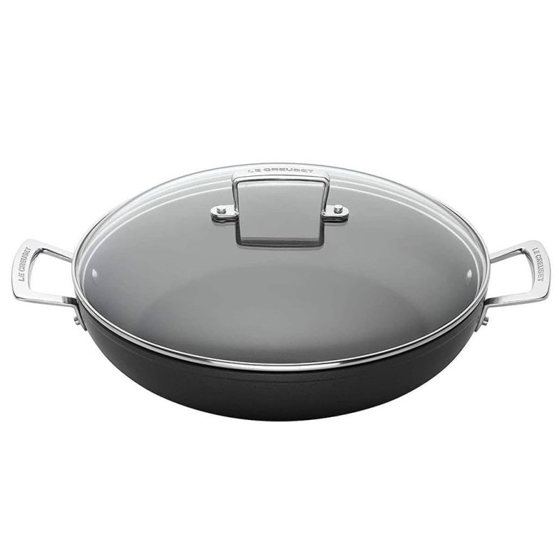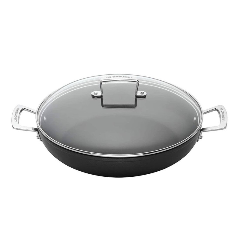 The Le Creuset shallow non-stick casserole delivers healthy, flavorful cooking with ease. Crafted from hard-anodized aluminum and featuring Le Creuset’s most advanced non-stick coating—four times stronger and completely PFOA-free—it ensures even heat distribution and effortless food release. The heat-resistant glass lid locks in moisture and flavor while allowing you to monitor cooking without lifting it. Suitable for all heat sources, including induction and oven use, this pan combines durability, elegance, and performance, all backed by Le Creuset’s lifetime guarantee.
