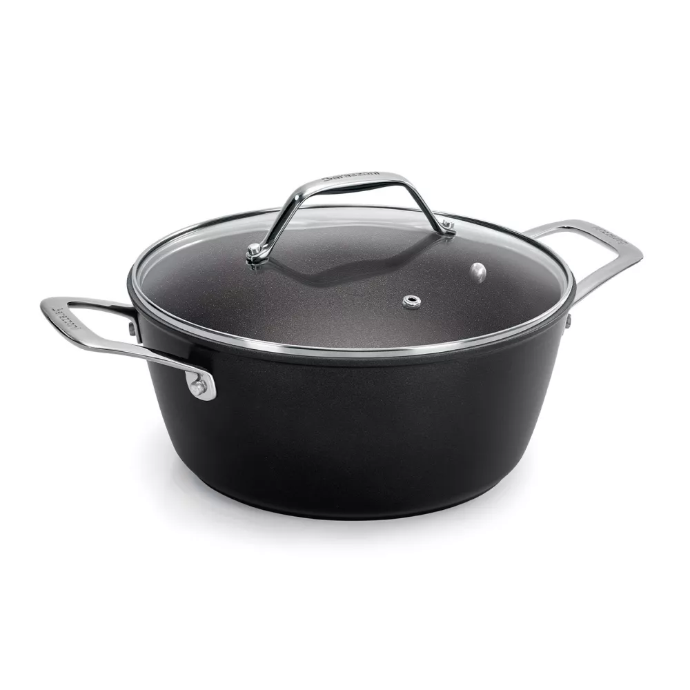 BARAZZONI CASSEROLE WITH LID, 20 cm DIAMETER, BLACK TITAN; Cod. 85560202498 This line has also been upgraded with the new state-of-the-art coating. The non- stick feature lasts a very long time and is resistant to damage caused by intensive use. Aluminium with non-stick coating Aluminium with non-stick coating Ø cm 24 - lt 4,1 Steel Handle