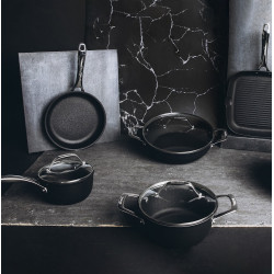 Frypan 32 cm, Black Titan collection Material: Extra strong, forged aluminum in cast look with reinforced frypan rim. Titan Pro non-stick coating with outstanding resistance to abrasion and scratches. Professional grade cast stainless steel handle, securely riveted. Suitable for all types of stoves, also for induction cooktops. Ovenproof up to 230°C. Code: 85560603298