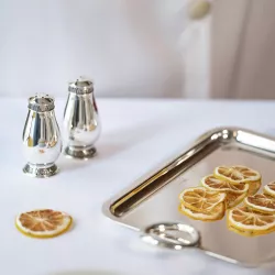 A refined silver-plated salt and pepper shaker set from Christofle’s Malmaison collection, a hallmark of the Empire style. Inspired by the "Château de la Malmaison," the favorite residence of Napoleon Bonaparte and Empress Josephine, this set is adorned with intricate water leaf and lotus flower motifs, reflecting the elegance and symmetry of the imperial aesthetic.