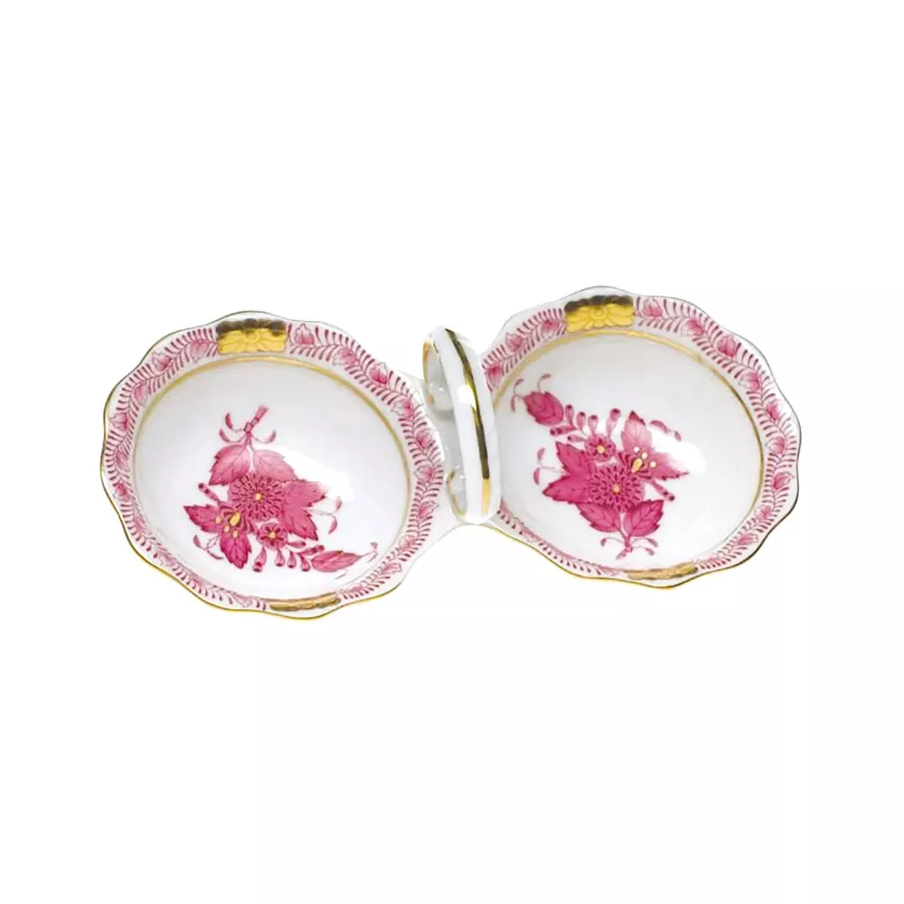The dècor, also known as the Chinese Bouquet, was created for Count Albert Apponyi, a famous Hungarian politician and diplomat of the late 19th century. The motif represent a basket of stylized Indian flowers painted rigorously freehand by the master painters of Herend. Salt shaker and pepper box Material: fine china with gold decorations Code: 1253 Hand wash recommended Never microwave an item with gold or platinum trim