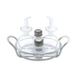 The Albi oil and vinegar cruet set includes a silver plated rack with center handle and two crystal cruets/bottles with stoppers to hold oils and vinegars. The Albi line, created in 1968, takes its inspiration from a French town located between Toulouse and Bordeaux and its famous cathedral known for its remarkable architecture, clean straight lines and single nave.