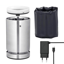 Code: 1540 0011 Battery lasting about 4-5 hours when selecting brightness level 3 - USB connector for charging the batteries Decorative LED lighting at the top and bottom of the wine cooler with 3 brightness levels WMF Easy Touch technology for easy operation of the LED light ring Cooling battery, flexible and unbreakable (flat storage in the freezer possible)