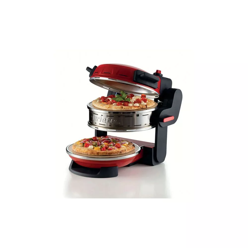 Electric oven for two pizzas, equipped with two refractory stones each with a diameter of 32 cm and a non-stick coating. It includes two independent thermostats and offers five cooking levels. It can reach a maximum temperature of 400°C, perfect for baking two pizzas simultaneously. Patented product. Red color. Article number: 0927/00